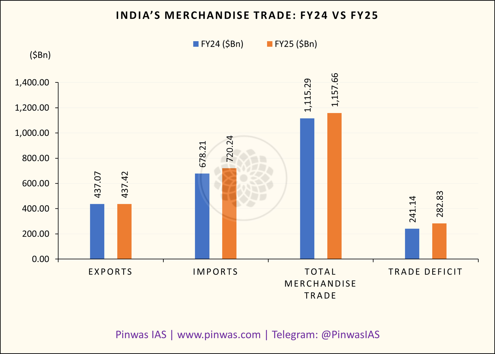 India’s Merchandise Trade in FY 2024–25 exhibited a mixed trajectory — while exports remained almost stagnant, imports rose sharply, leading to a significant widening of the trade deficit.